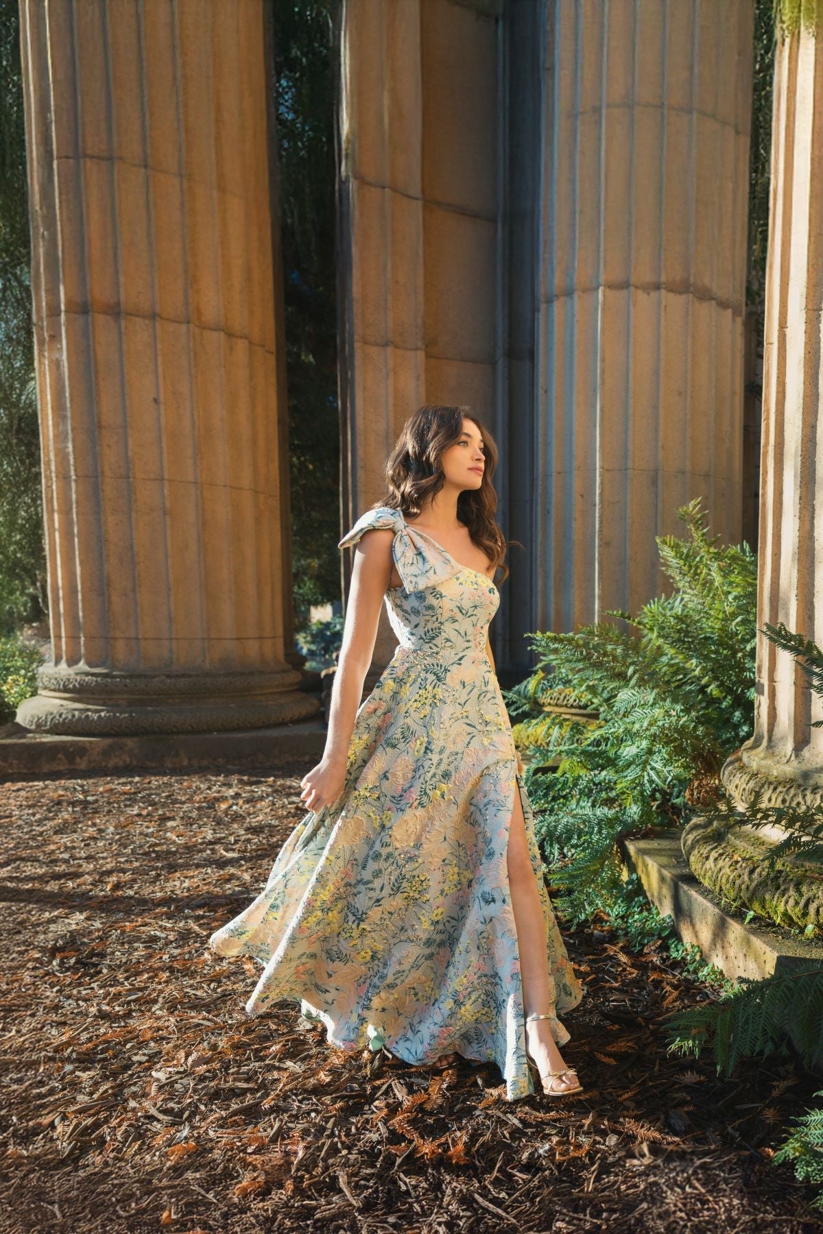 Crafted from brocade fabric, this stunning gown features an exaggerated bow at the shoulder for a touch of dramatic flair. The sleeveless one shoulder neckline adds a modern and elegant touch, while the allover brocade detailing elevates the look.