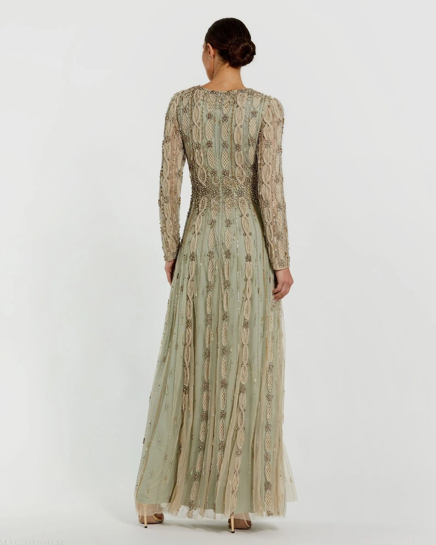 This elegant A-line gown is crafted from embellished mesh fabric, featuring a high neckline with beaded trim and intricate beading throughout. A concealed back zipper ensures a perfect fit, while the fully lined design adds comfort. Perfect for any special event, this gown combines timeless elegance with modern details.