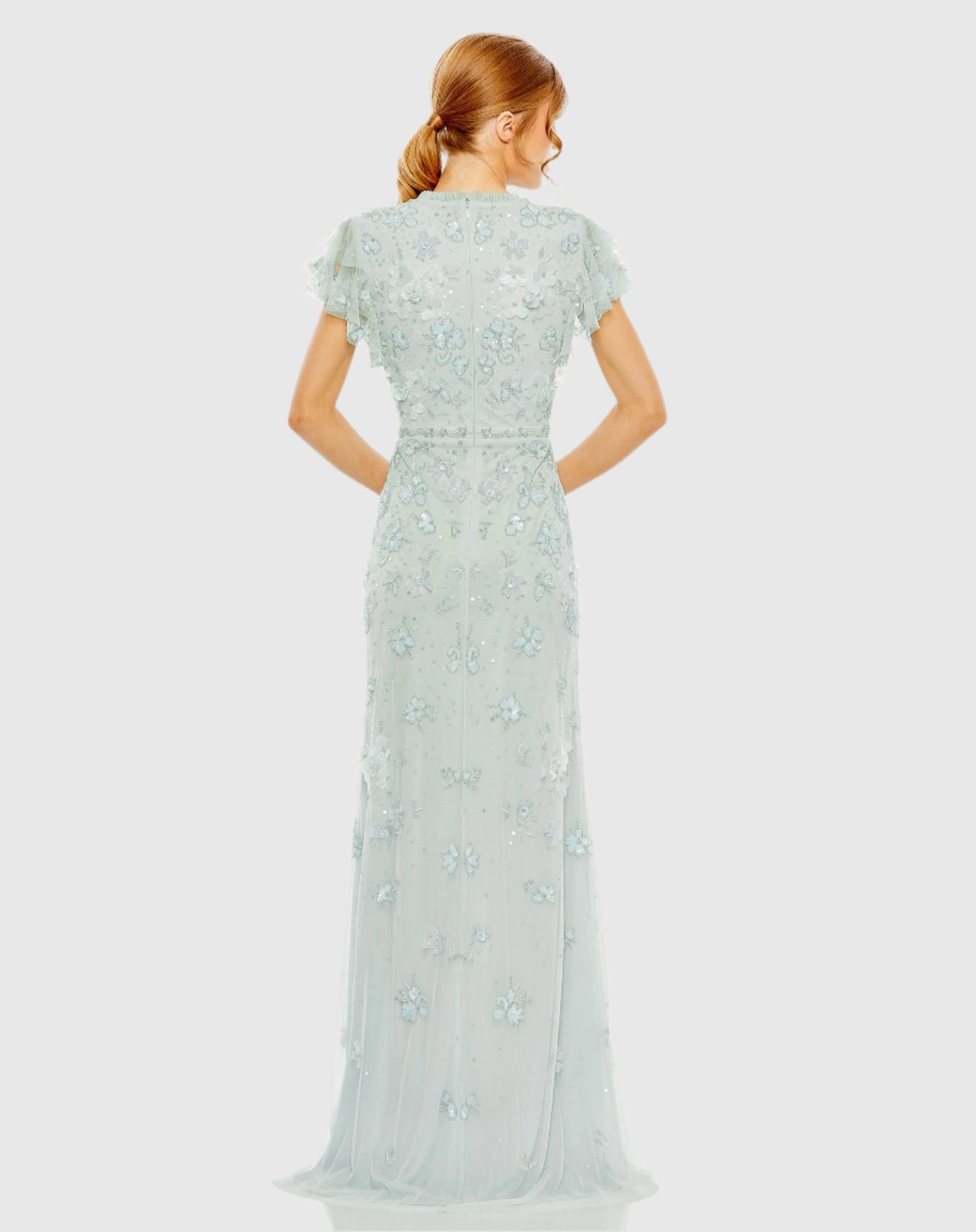 This elegant gown features a high neckline and short flutter sleeves for a sophisticated silhouette. The embellished mesh fabric, adorned with delicate floral embellishments, adds a touch of glamour, making it perfect for special occasions and a stunning addition to your wardrobe.