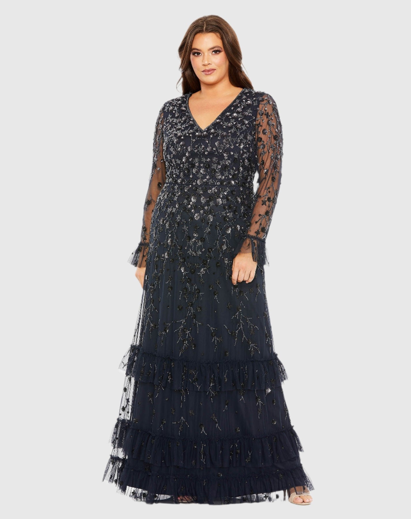 Elevate your look with our Mac Duggal 9271 Dress. This V-Neck gown features stunning embellishments and flowing flutter sleeves, perfect for elegant events. The beaded and embellished mesh fabric adds a touch of glamour, while the ruffle tiered hem and delicate sequined pattern add a playful touch. Available in Midnight.