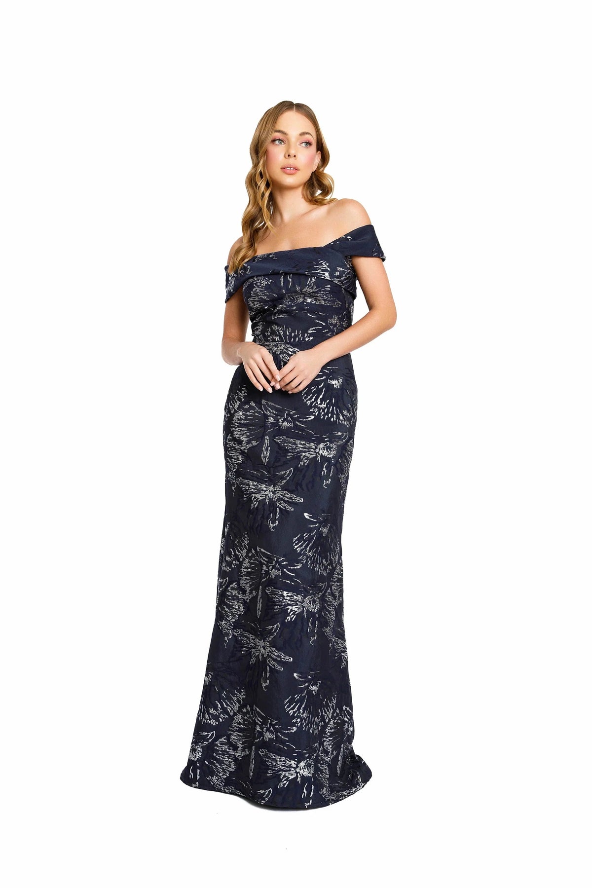 Get ready to turn heads with our NICOLE BAKTI 7176 Dress! This elegant gown boasts an off-shoulder neckline and luxurious brocade fabric with a unique print. Perfect for formal occasions, it effortlessly blends classic beauty with a modern twist. Make a statement and exude sophistication in this show-stopping dress.