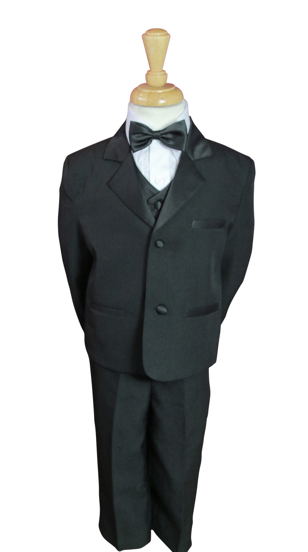 Introduce your young gentleman to timeless elegance with the Peanut Butter Collection Bond Black Tuxedo in Husky sizing. Specially tailored for fuller frames, this complete formal ensemble features a structured jacket, matching pants, coordinating vest, crisp shirt, and classic bow tie everything needed for weddings, ring bearer duties, and special occasions. Crafted from durable 100% polyester, it delivers comfort and a polished appearance that lets your child shine with confidence on his big day.