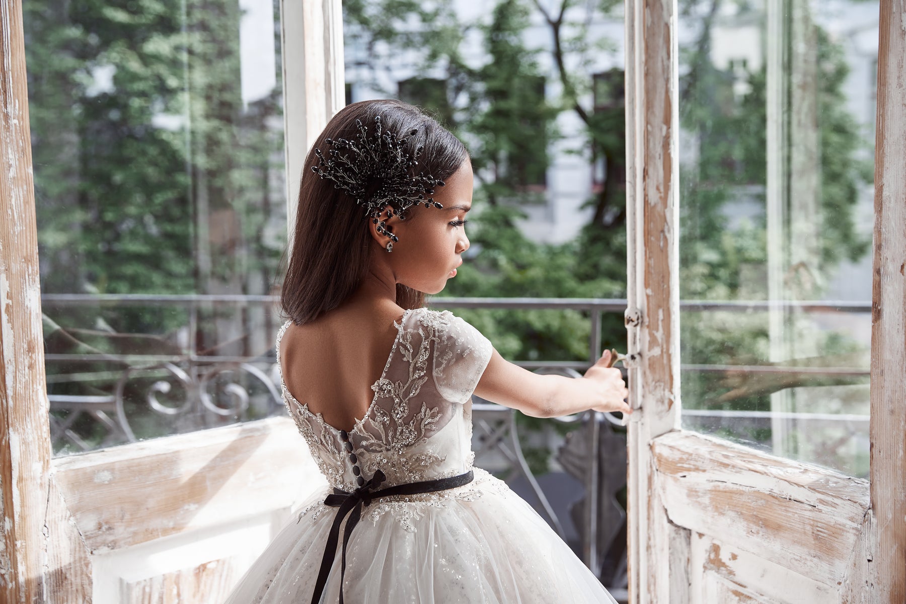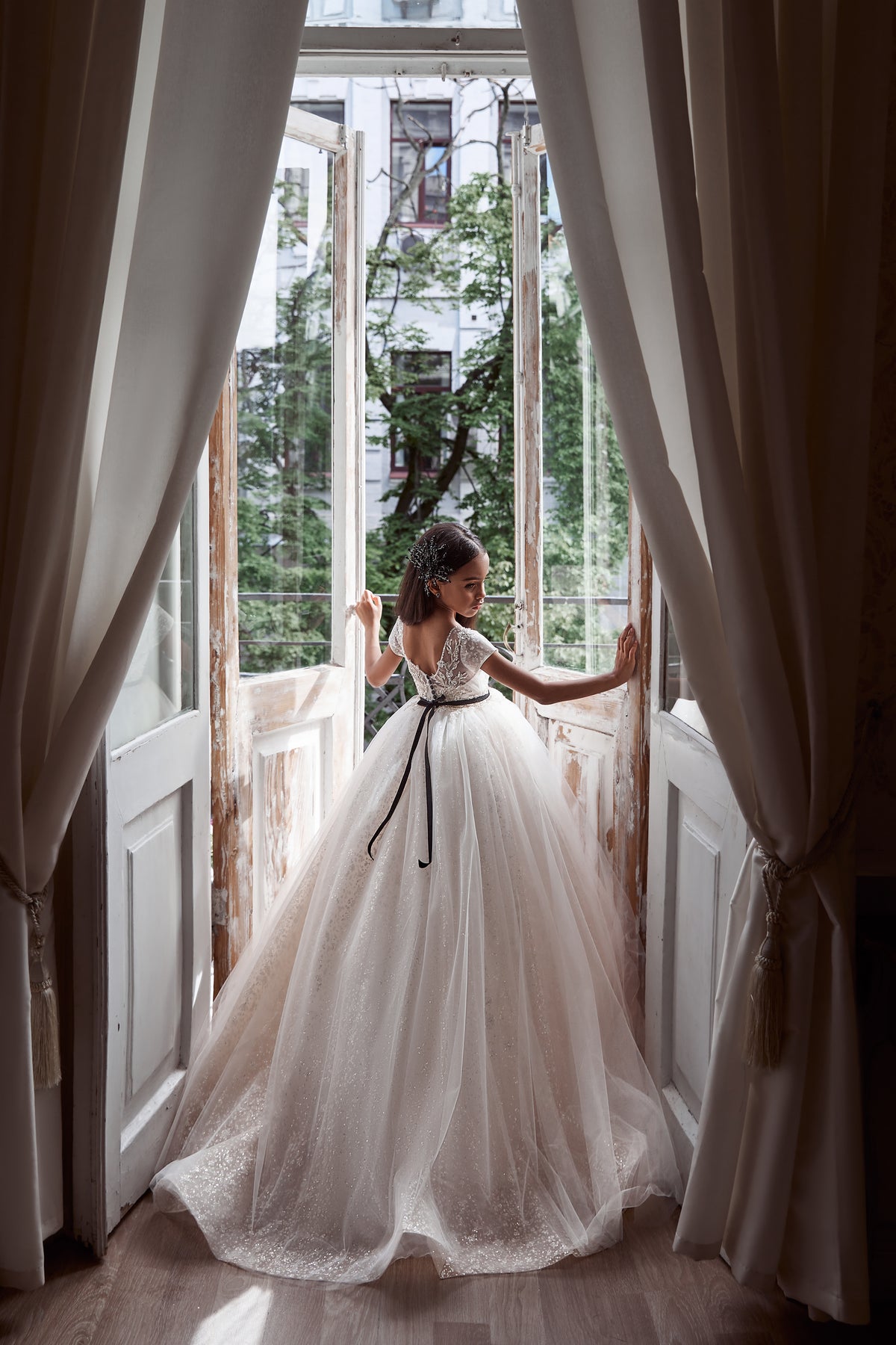 This adorable ball gown features a sweet heart neckline with a delicate transparent semi-neck design, adding a touch of charm and elegance. The open back and half sleeves create a playful yet graceful look, perfectly balanced by a sleek black belt at the waist that highlights the silhouette. Perfect for special occasions, this long dress combines classic style with a cute, youthful appeal.