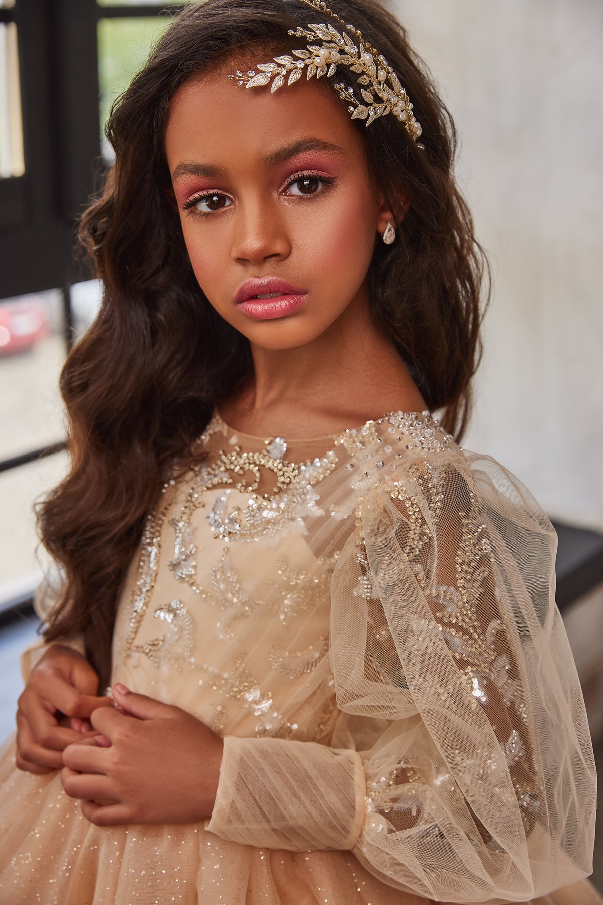 The perfect dress for your little princess! This elegant kids dress is perfect for special occasions. The bodice is intricately embroidered, and the long, flowing tulle skirt will make your little girl feel like a princess. Perfect for weddings, christenings, and other special occasions, your little girl will love wearing this dress.