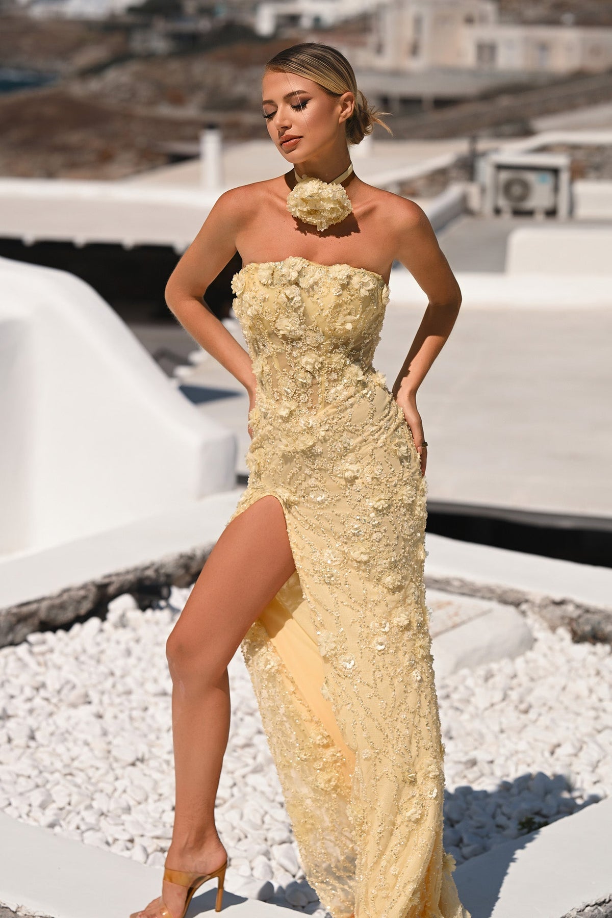 PS26011 features a sculpted corset bodice with visible boning that defines the waist and enhances the silhouette. Delicate 3D floral appliqués and soft bead embellishments cascade down the design, adding beautiful texture and dimension. A daring thigh-high slit adds a modern touch of allure, while the softly flared hem moves gracefully with every step.