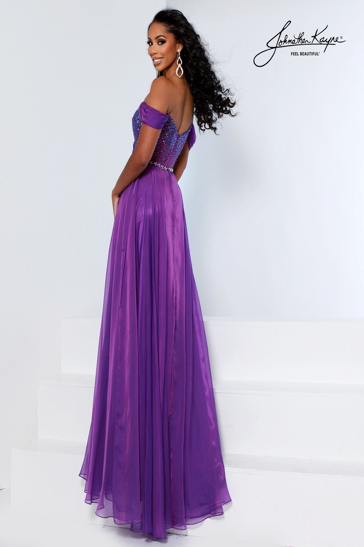 Command the room in this stunning Johnathan Kayne 3217 dress. The off-the-shoulder design showcases iridescent chiffon that catches light beautifully, while the exposed corset provides structured elegance. A softly draped overlay adds dimension and movement, flowing seamlessly into an A-line silhouette that flatters every figure. The strategic slit delivers just the right amount of confidence and sophistication. Perfect for making an unforgettable entrance at any special occasion.