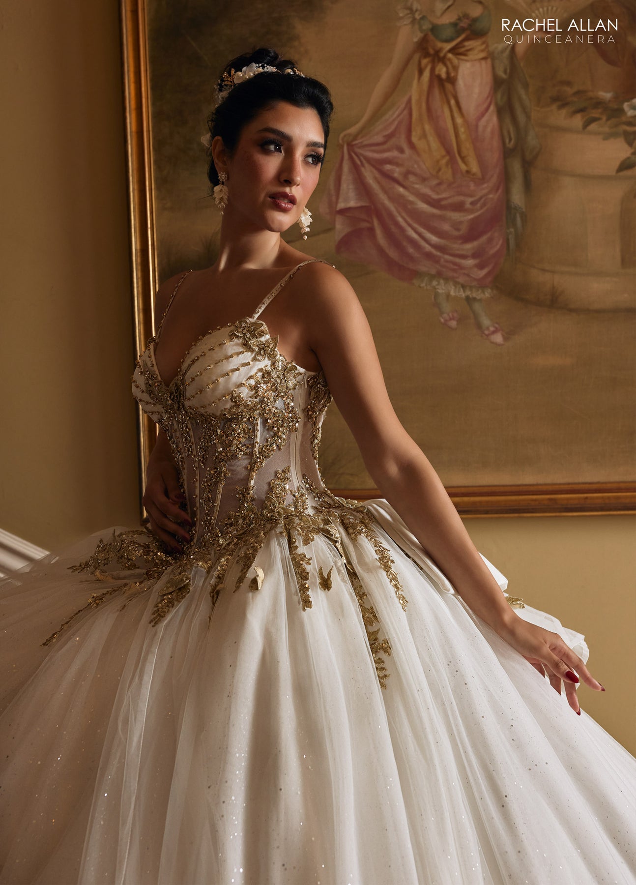 Step into the spotlight with the Rachel Allan RQ1158 Dress, a playful blend of luxury and charm. Choose blush gold or ivory gold to shine in a glittering tulle skirt that moves with magic. Golden embroidery, beads, and delicate appliqués bring royal flair, while 3D butterflies and embroidered fringe add delightful whimsy. The structured bodice with delicate straps and a detachable liner lets you switch up your style, and a large, detachable bow at the back seals the look with a fun, elegant flourish. Perfect for making unforgettable memories!