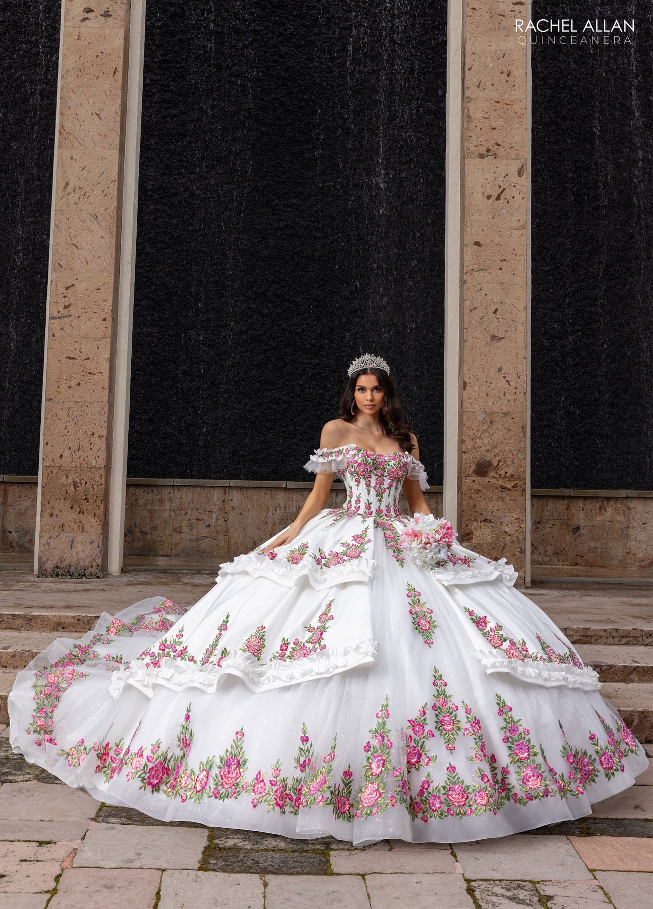 Step into the spotlight with the Rachel Allan RQ5015 Dress, offered in lively Champagne Red or White Fuchsia. This playful taffeta gown captivates with vivid floral embroidery and charming 3D flowers, while layers of glitter tulle add a sparkling touch. Its flowing silhouette is perfectly complemented by a detachable ruffled jacket, adding a whimsical flair. Ideal for quinceañeras, fiestas, or any celebration, this dress harmonizes classic tradition with a fresh, modern twist to make every moment unforgettable.