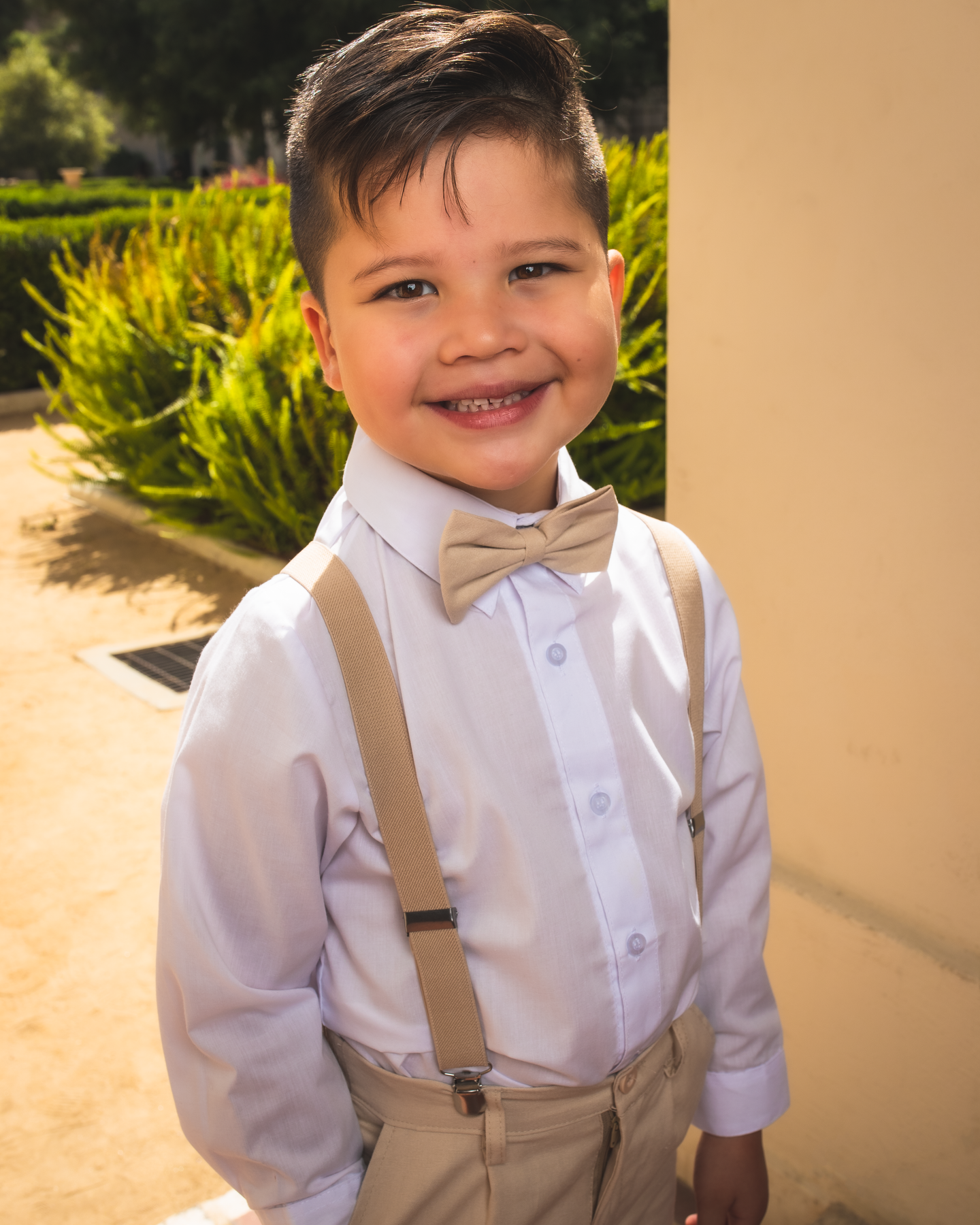 Introduce your little one to timeless elegance with this charming Barn Wedding Set in Safari Sand. Crafted from 100% linen, this slim-fit ensemble combines comfort with sophisticated style, making it ideal for ring bearers and formal occasions. Whether you're planning a rustic celebration or destination wedding, this versatile set delivers effortless charm. The complete package includes tailored pants, a crisp shirt, suspenders, and a coordinating bow tie—everything needed for a polished, put-together look. Durable linen construction ensures your child stays comfortable throughout the festivities while looking absolutely dapper.