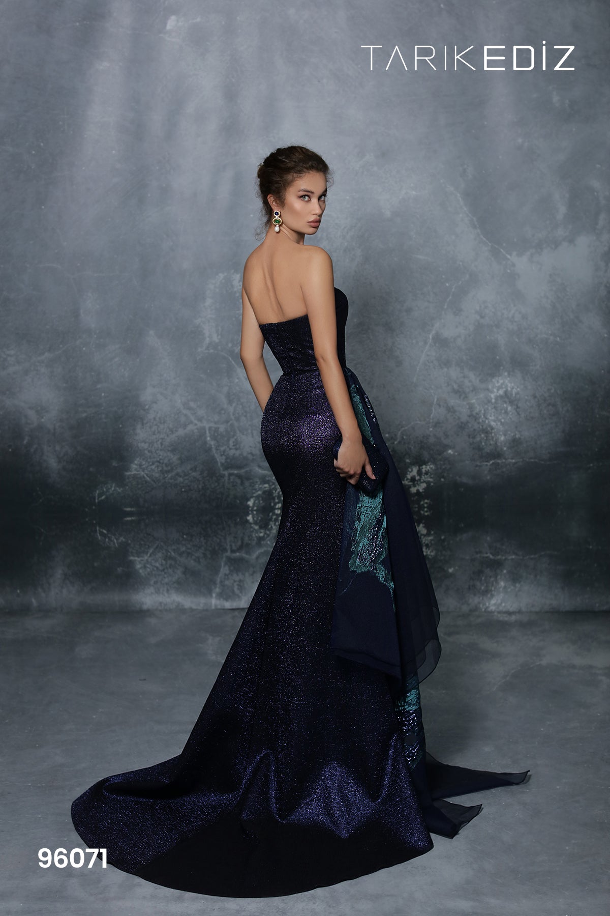 This prom or evening dress, designed by Tarik Ediz, offers a stylish and glamorous look. The open back and asymmetrical neckline add a modern touch, while the strapless design and long silhouette provide a timeless elegance. The dress features cascading ruffles and glitter accents, making it perfect for a special occasion.