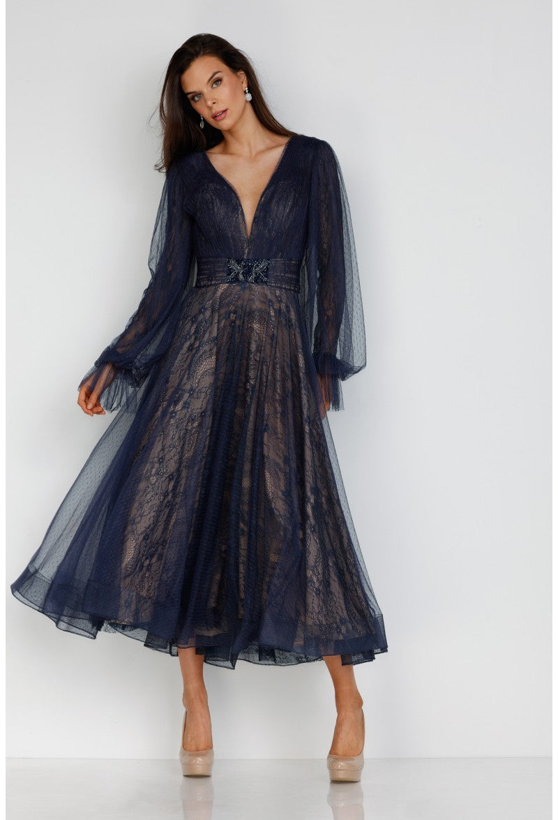 Say hello to your new favorite: the TERANI 231C0224 double-layered lace gown. This classy, mid-length dress features a flowy silhouette crafted from delicate two-tone lace fabric, giving it a mysterious yet elegant vibe. The deep V-neckline pairs perfectly with puffy full sleeves and a beautifully embellished belt that highlights the waist. Available in stunning navy nude and wine nude shades, this gown promises to make you feel graceful and effortlessly chic at any event.