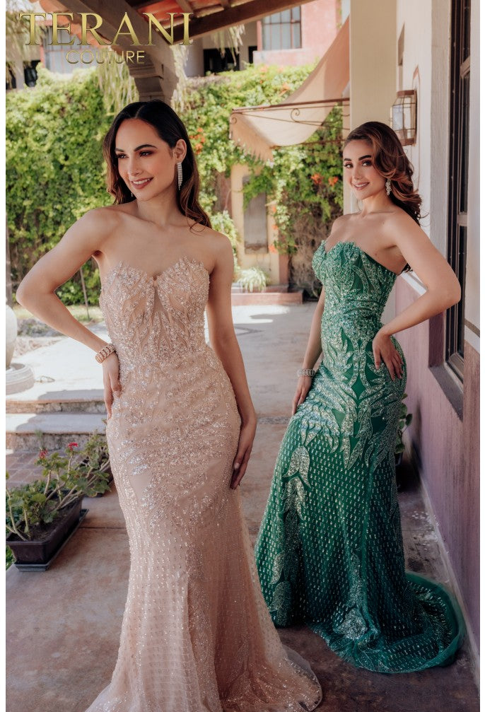 The TERANI 232GL1442 Dress is designed for those who want to shine. Featuring a strapless neckline and detailed embroidery, this mermaid silhouette gown is elevated with sparkling accents that bring a glamorous touch. Available in sizes 0 to 24, it offers a secure fit with a zipper and hook-and-eye closure. Perfect for formal occasions, this dress helps you make a stunning, unforgettable entrance.