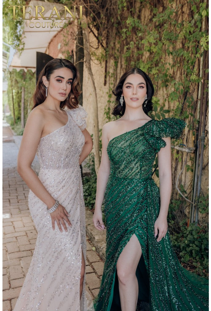 The TERANI 232GL1479 Dress offers a stunning blend of elegance and glamour. Featuring a one-shoulder neckline and a sheer bodice with delicate ruffled details, it is enhanced by intricate beadwork that catches the light beautifully. The flowing A-line silhouette provides a flattering fit for all. Available in sizes 0-24, this dress secures comfortably with a zipper and hook and eye closure. Perfect for special occasions, it helps you express timeless beauty with confidence.