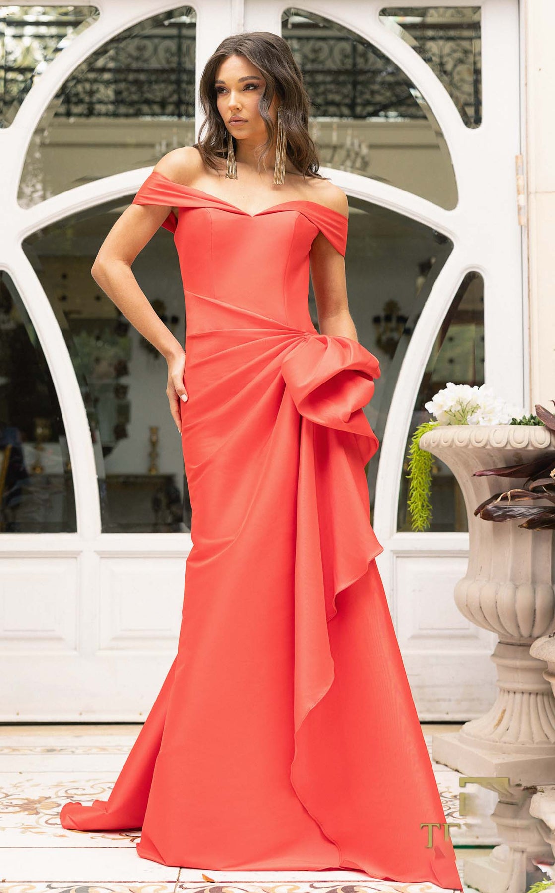 This glamorous and elegant Terani 242M3335 Dress long column dress can be the suitable pick for any sort of events. The dress has a sweetheart neckline and off-shoulder sleeves, giving it a sophisticated and elegant look. It’s made from a stretch Mikado fabric, which is both comfortable and elegant. It also features a slit for added style and movement. The closure of the dress consists of both a hook and eye, as well as a zipper located at the back. The dress is available in a variety of colors- black, emerald, navy, red, and turquoise, so you can choose the one that best suits your personal style. Overall, this dress can be a beautiful and elegant pick for any wedding events.