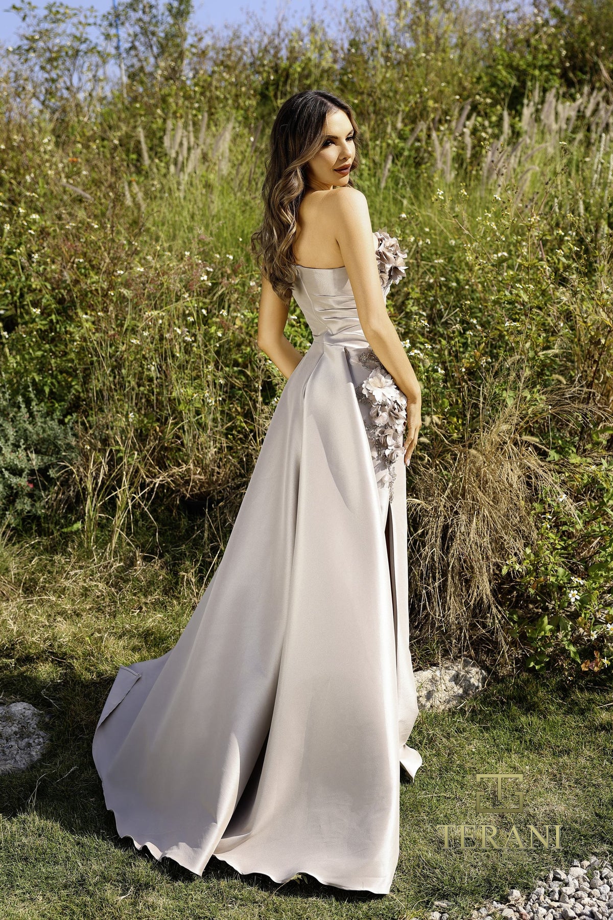 The Terani 252E5116 Dress is a sophisticated metallic jacquard gown featuring dramatic chest draping and a mock wrap silhouette. Accented with a beaded overskirt, it showcases an asymmetric one-shoulder neckline and a high slit, combining graceful movement with bold style. This extension gown elegantly overlays a fitted sheath cut, perfect for those seeking refined glamour with a modern edge.