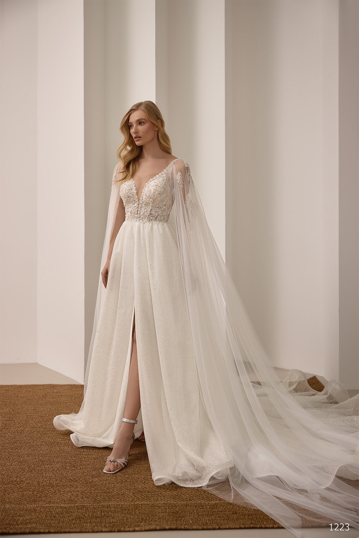 The Vissaria 1223 Dress is an elegant bridal gown designed to make you feel radiant on your special day. This stunning piece features a flattering V neckline and delicate straps that frame the shoulders beautifully, while the open back adds an alluring touch of sophistication. The flowing silhouette is enhanced by a high slit that offers graceful movement and modern style. Perfect for brides seeking a dress that combines timeless elegance with contemporary design, this gown celebrates your beauty and confidence as you walk down the aisle.
